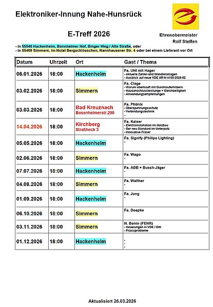 Termine E-Treff 2026 der Elektroniker-Innung Nahe-Hunsrück