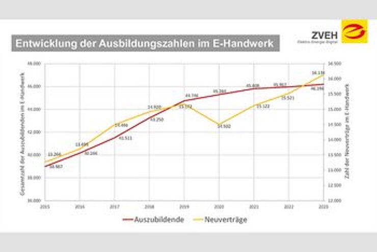 Betrachtet man die einzelnen e-handwerklichen Berufsbilder, ist der/die Elektroniker/-in Fachrichtung Energie- und Gebäudetechnik nach wie vor der größte und damit wichtigste Beruf. Wurden hier 2022 insgesamt 40.517 Auszubildende gezählt, stieg die Zahl der Auszubildenden im beliebtesten Beruf der E-Handwerke 2023 um 1,2 Prozent auf 41.018 Auszubildende. Bei den Neuverträgen legte der/die Elektroniker/-in Fachrichtung Energie- und Gebäudetechnik um 604 Auszubildende auf 14.454 Auszubildende (2022: 13.850) zu. Das entspricht einem Plus von 4,4 Prozent.