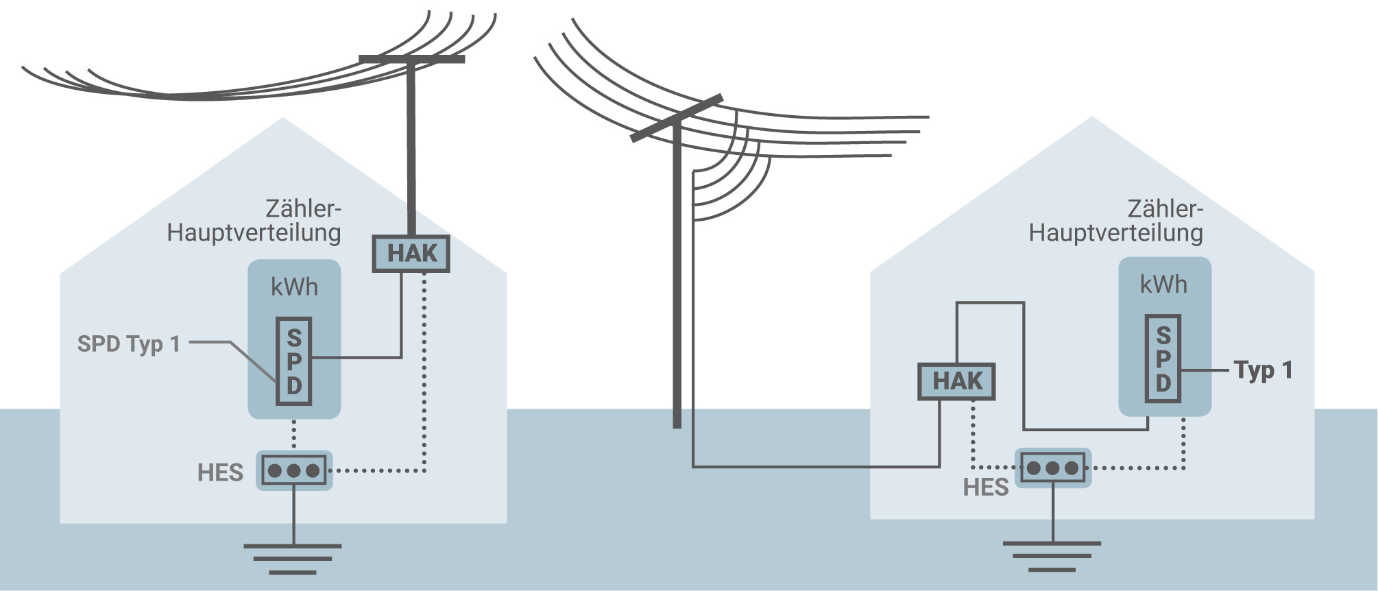 Bei Gebäuden mit Freileitungseinspeisung müssen immer SPDs Typ 1 eingesetzt werden, weil in Deutschland auch der direkte Blitzeinschlag in den letzten Mast der Freileitung nahe dem Gebäude immer berücksichtigt wird. Dies gilt auch, wenn die Versorgungsleitung zwischen dem letzten Mast der Freileitung und der baulichen Anlage als Erdkabel ausgeführt wird – Bild 4.