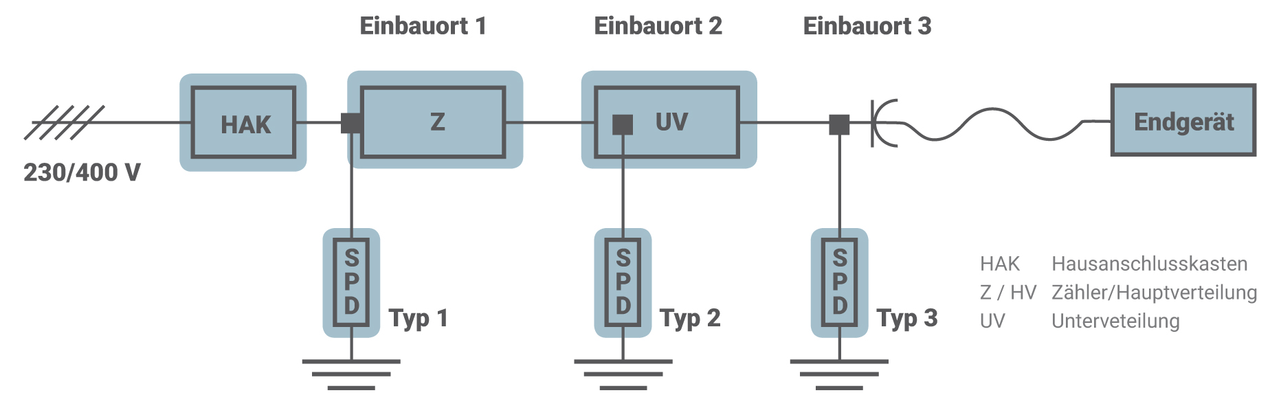 Der Schutz gegen Auswirkungen bei transienten Überspannungen wird durch die Installation von Überspannungs-Schutzeinrichtungen (SPDs) realisiert. Diese müssen nach der Produktnorm DIN EN 61643-11 (VDE 0675-6-11): 2013-04 geprüft sein. VDE 0675-6-11 beschreibt die unterschiedlichen SPD Typen